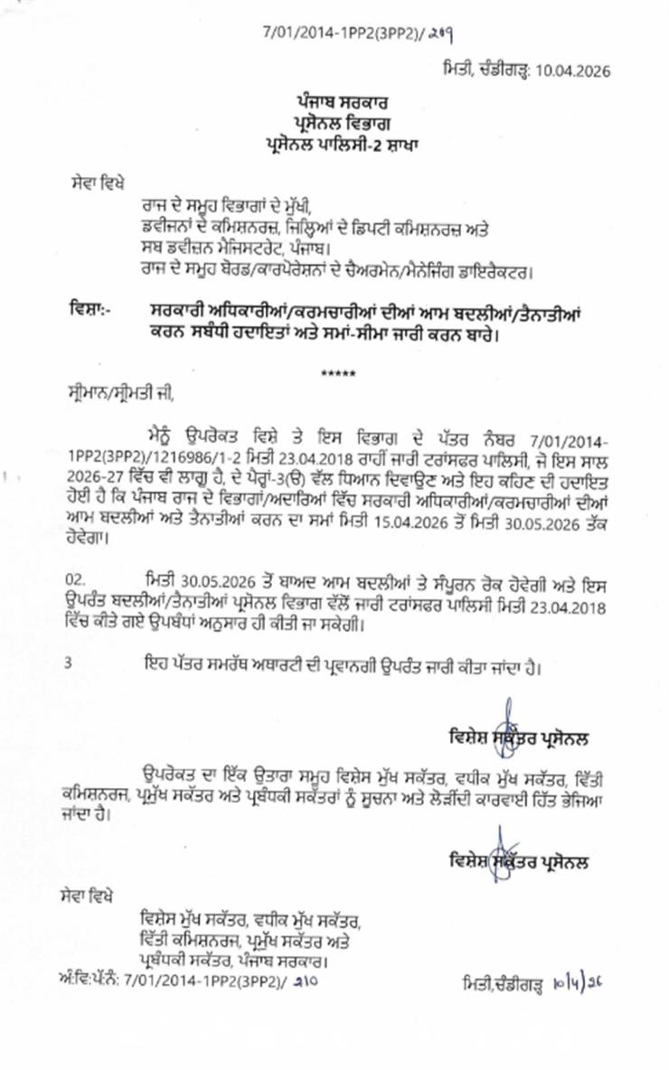 ਪ੍ਰਸੋਨਲ ਵਿਭਾਗ ਵੱਲੋਂ ਜਾਰੀ ਪੱਤਰ ਅਨੁਸਾਰ, ਪੰਜਾਬ ਦੇ ਵੱਖ-ਵੱਖ ਵਿਭਾਗਾਂ ਅਤੇ ਅਦਾਰਿਆਂ ਵਿੱਚ ਕੰਮ ਕਰਦੇ ਕਰਮਚਾਰੀਆਂ ਦੀਆਂ ਆਮ ਬਦਲੀਆਂ 15 ਅਪ੍ਰੈਲ 2026 ਤੋਂ 30 ਮਈ 2026 ਤੱਕ ਕੀਤੀਆਂ ਜਾ ਸਕਣਗੀਆਂ।